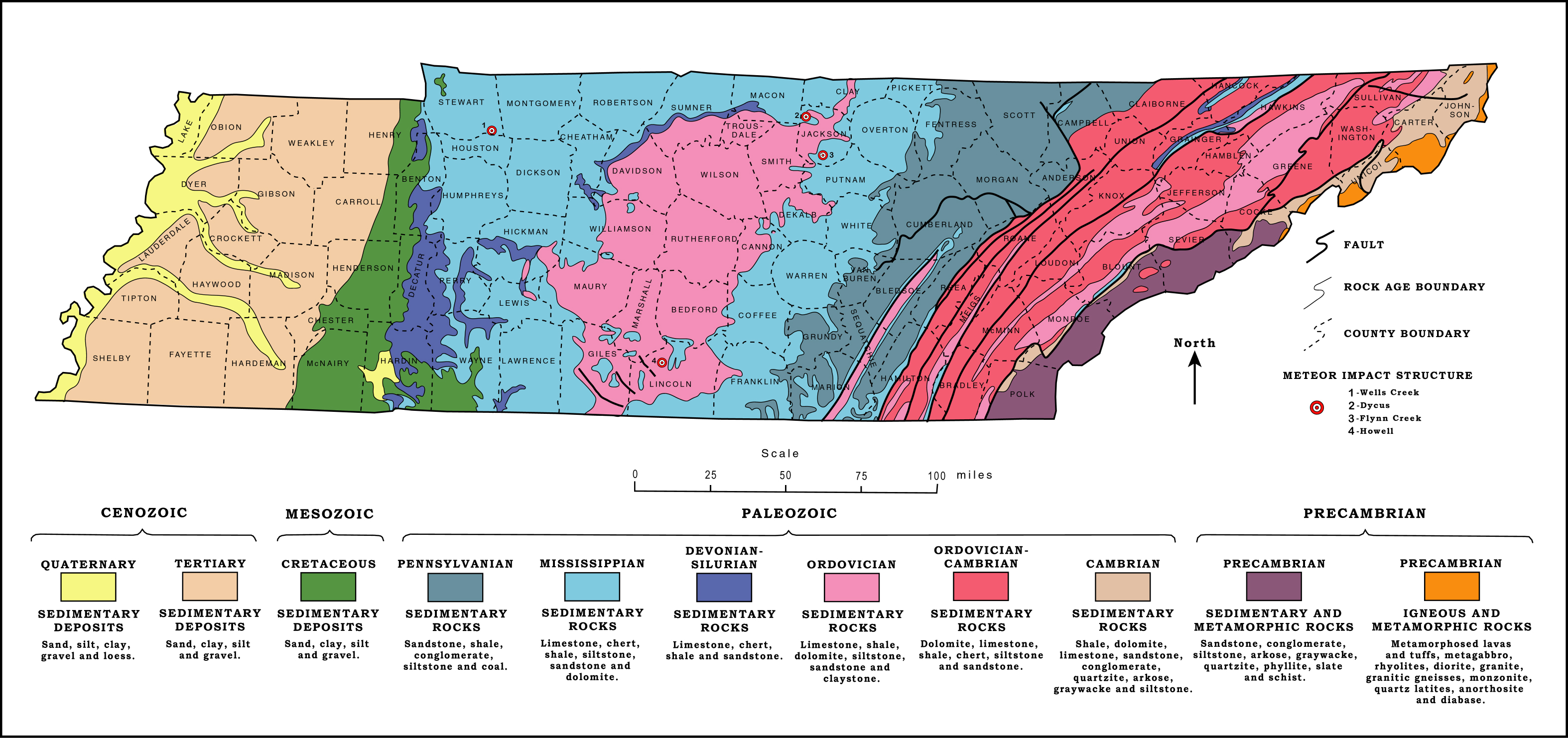 Spanning 450 miles, Tennessee's geologic provinces each boast a unique history. After tectonic forces raised eastern Valley and Ridge provinces, central Tennessee was submerged to receive layered carbonate deposits left by ancient sea creatures. A volcanic plume later pushed these rocks up into huge dome that gradually eroded to form Nashville's central basin, exposing these fossils from the Ordovician period. The western provinces were again flooded by ocean during the age of dinosaurs, leaving Cretaceous fossil beds in sites like Coon Creek. Finally the Mississippi carved valley and flood terrain along the west. Click the color map below for details of Tennessee rocks, or Arrows to explore stratigraphic maps. |