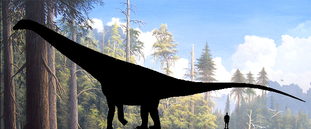 Above: Argentinosaurus huinculensis silhouetted against a Jurassic landscape, with human figure for scale. To the right, the flying pterosaur Quetzalcoatlus northropi.
